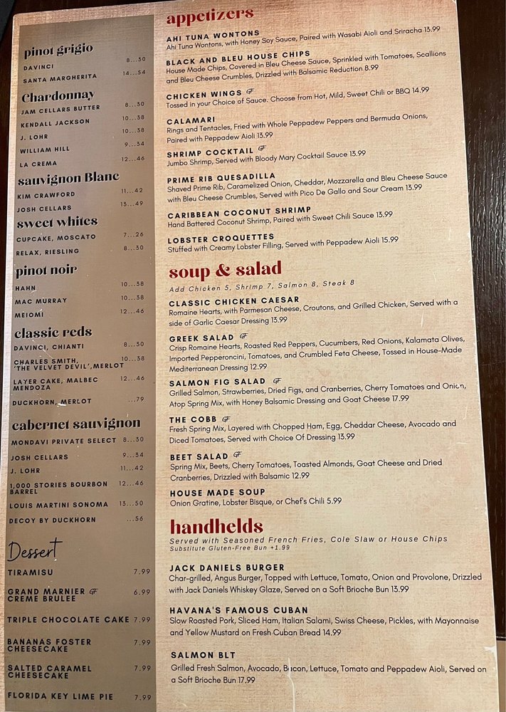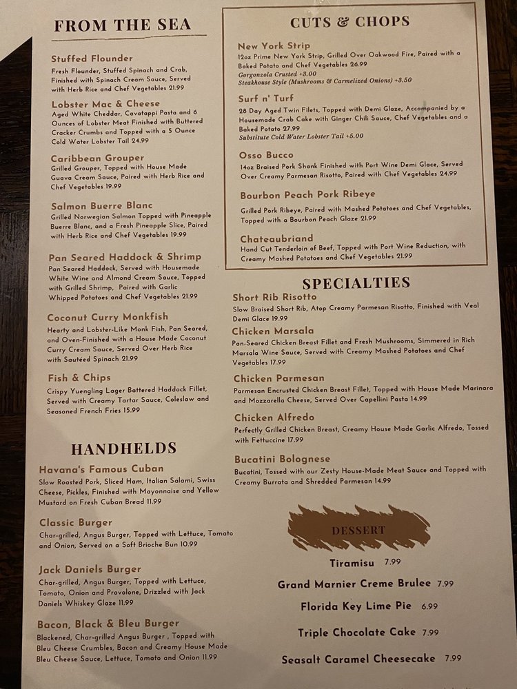 Introducing the menu at Havana Country Club Restaurant, a fusion of American, Seafood, and Italian cuisine, offers a delightful dining experience. Located in The Villages, FL, this restaurant provides a range of amenities such as reservations, delivery, takeout, and wheelchair accessibility. The reviews rave about the fantastic food, excellent service, and inviting atmosphere. Highlights include the diverse menu options like the chicken parm, quesadillas, chili, and salmon. The attentive staff, scenic outdoor seating, and classy yet casual ambiance make it a perfect spot for dinner with friends or family. Regulars praise the management's care for patrons and consistent quality. If you're craving delicious food, impeccable service, and a pleasant dining environment, Havana Country Club Restaurant is the place to be.